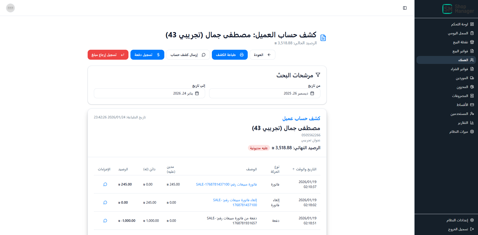 سجل مالي كامل لكل عميل مع تتبع المديونيات والدفعات والأرصدة.