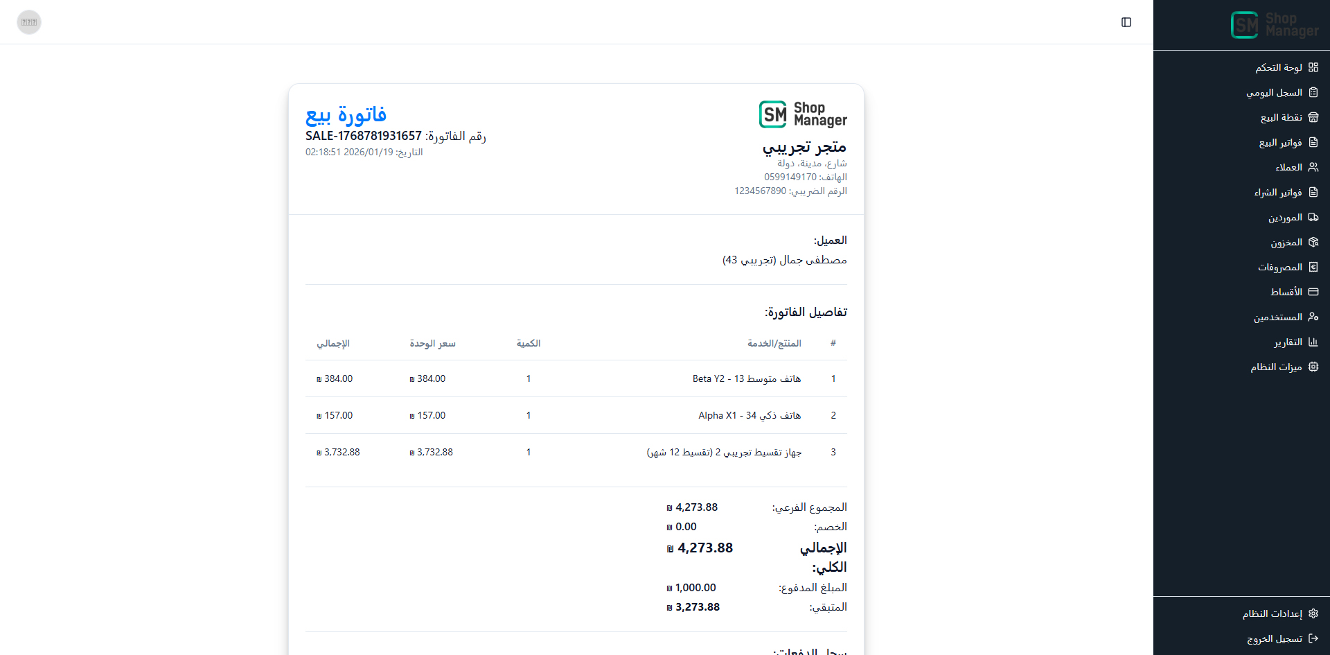 إنشاء فواتير بيع سريعة مع دعم الخصومات، الدفعات المتعددة، والطباعة الفورية.
