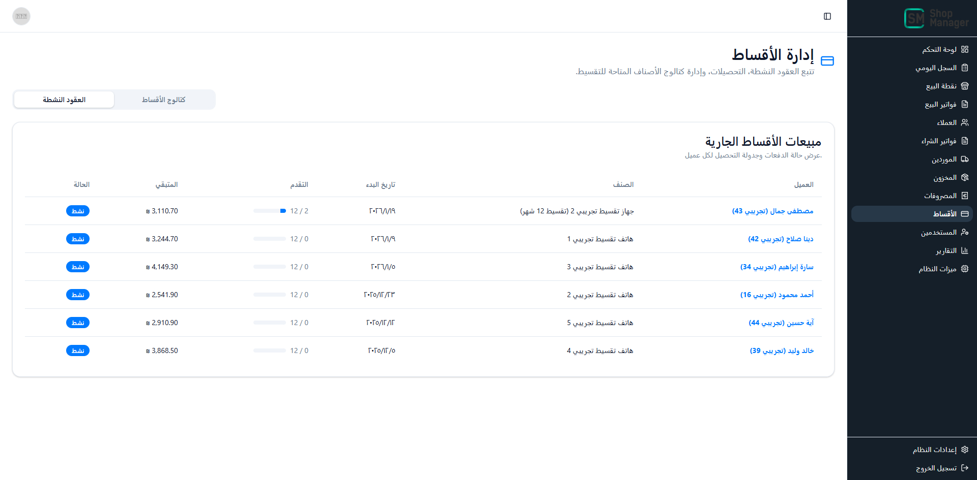 نظام أقساط متكامل مع جدولة الدفعات، تتبع المدفوعات، وتحديث تلقائي لكشف الحساب.