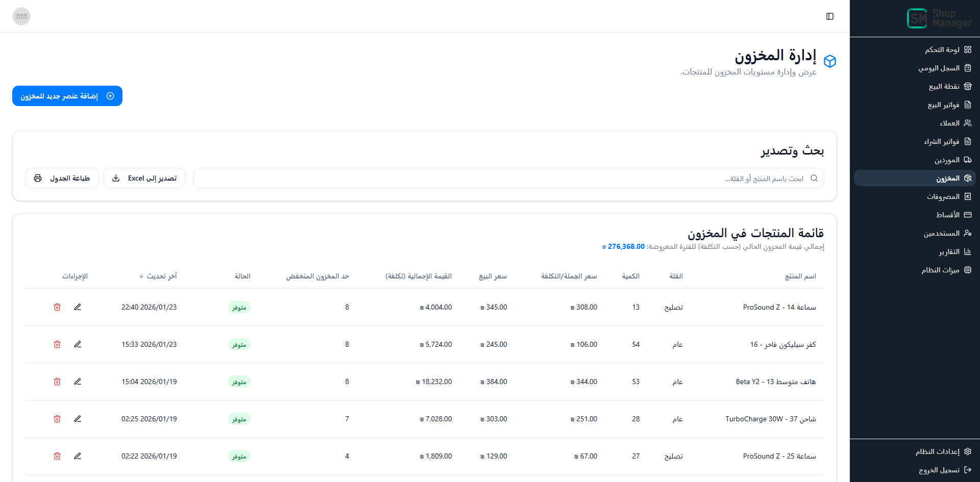 تتبع المخزون بدقة مع تحديث تلقائي عند البيع والشراء، وتنبيهات نفاذ الكمية.