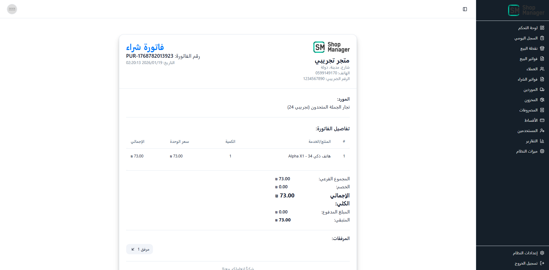 عرض احترافي للفواتير مع إمكانية الطباعة المباشرة أو التصدير PDF.